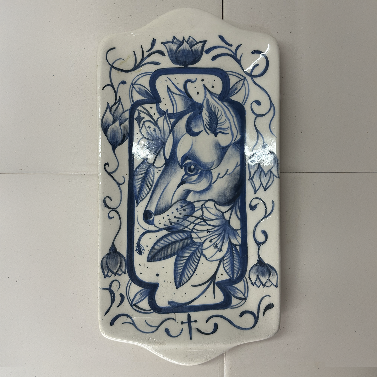 Plato de cerámica artesanal pintado a mano, con ilustración en azul sobre fondo marfil. El diseño presenta un zorro enmarcado por motivos florales y ornamentales, inspirado en la iconografía tattoo tradicional y su simbolismo de astucia, intuición y adaptación. La composición equilibra fuerza y delicadeza, destacando la atención al detalle y el carácter del trazo. El trazo manual y las variaciones del pincel aportan profundidad y expresión a la pieza, mientras que cada plato es único, con leves diferencias propias del proceso artesanal. Cuenta con esmaltado brillante, ideal como pieza decorativa o para uso cotidiano. Funcional y decorativo, pensado para quienes confían en su instinto.