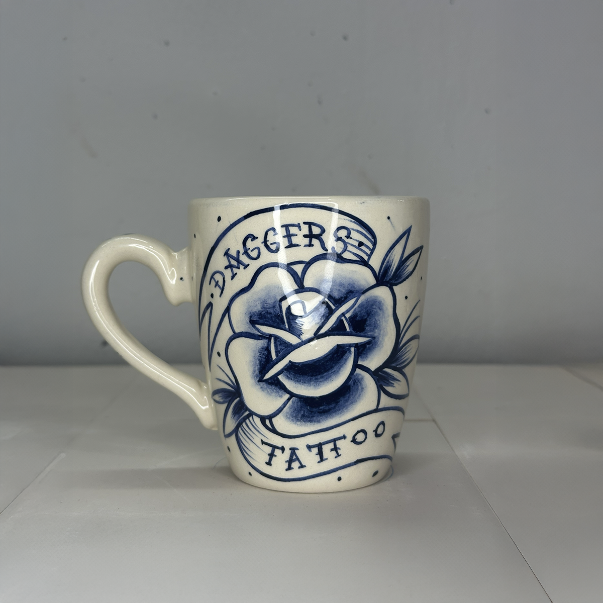 Taza de cerámica artesanal pintada a mano, con ilustración en azul sobre fondo marfil. El diseño presenta una rosa atravesada por una daga, acompañada por banners con la inscripción Daggers Tattoo, un símbolo clásico de fuerza, lealtad y decisión. Inspirada en la iconografía tradicional del tattoo, esta pieza combina belleza y filo en una sola imagen. El trazo manual y las variaciones del pincel aportan profundidad y carácter a la ilustración, mientras que cada taza es única, con leves diferencias propias del proceso artesanal. Cuenta con esmaltado brillante y asa cómoda, ideal para café, té o infusiones. Funcional y decorativa, pensada para quienes llevan la marca en la piel y en el ritual diario.
