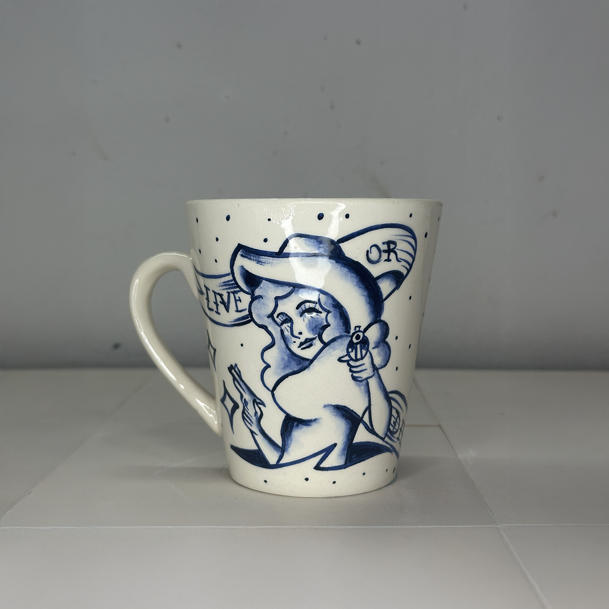 Taza de cerámica artesanal pintada a mano, con ilustración en azul sobre fondo marfil. El diseño presenta una figura femenina armada, de estética tattoo clásico, acompañada por banners con la frase Forever or Never, símbolo de elección, riesgo y decisión sin vuelta atrás. Inspirada en la iconografía old school, esta pieza remite a la suerte, el coraje y el destino. El trazo manual y las variaciones del pincel le aportan fuerza y carácter a la ilustración, mientras que cada taza es única, con leves diferencias propias del proceso artesanal. Cuenta con esmaltado brillante y asa cómoda, ideal para café, té o infusiones. Funcional y decorativa, pensada para quienes no dudan al elegir.