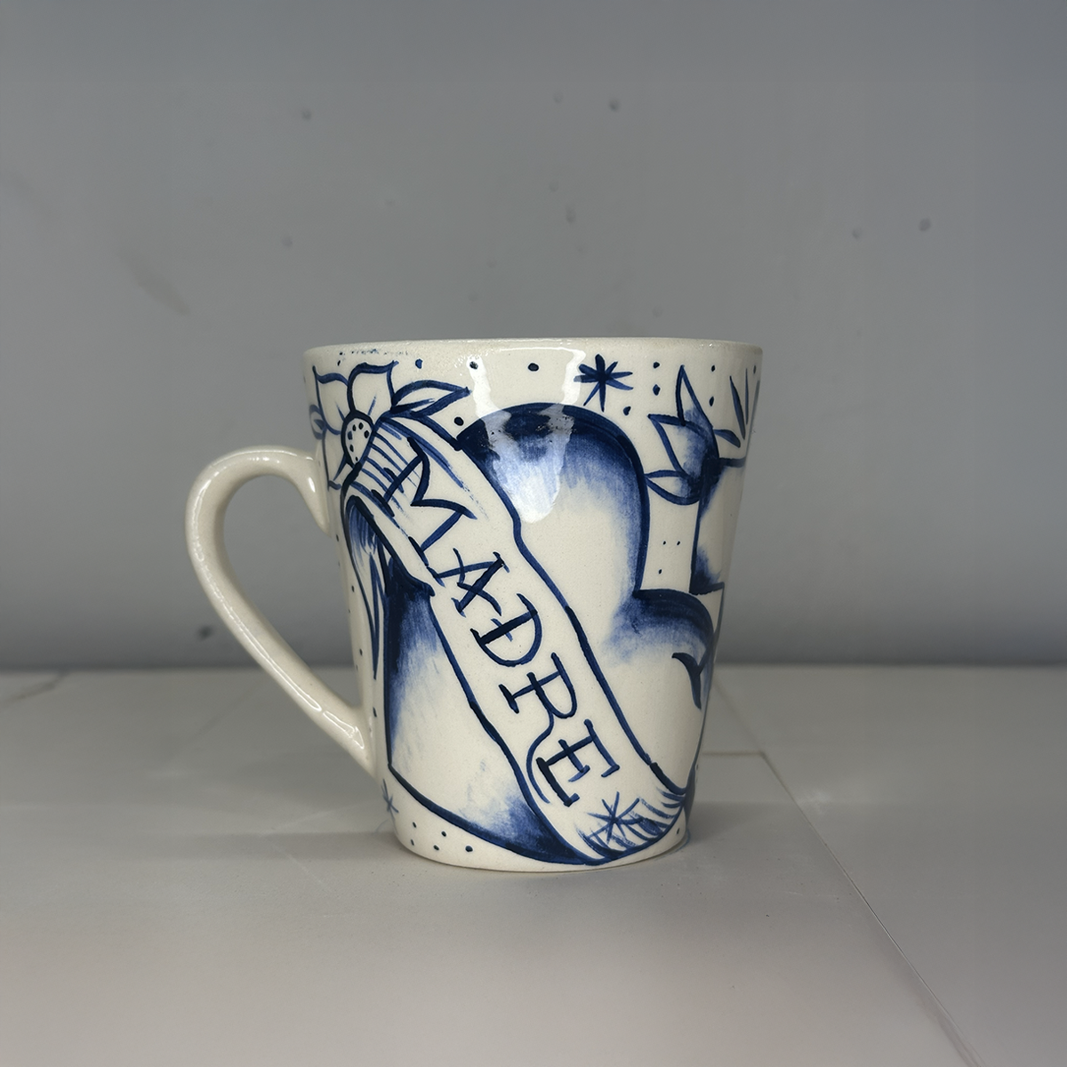 Taza de cerámica artesanal pintada a mano, con diseño de corazón en estilo tattoo y lettering “Hecha”, realizada en tonos azul sobre fondo marfil. Cada pieza es única, con trazos a pincel y detalles orgánicos propios del trabajo artesanal. Cuenta con esmaltado brillante y asa cómoda, ideal para café, té o infusiones. Funcional y decorativa, pensada para uso diario o para regalar.