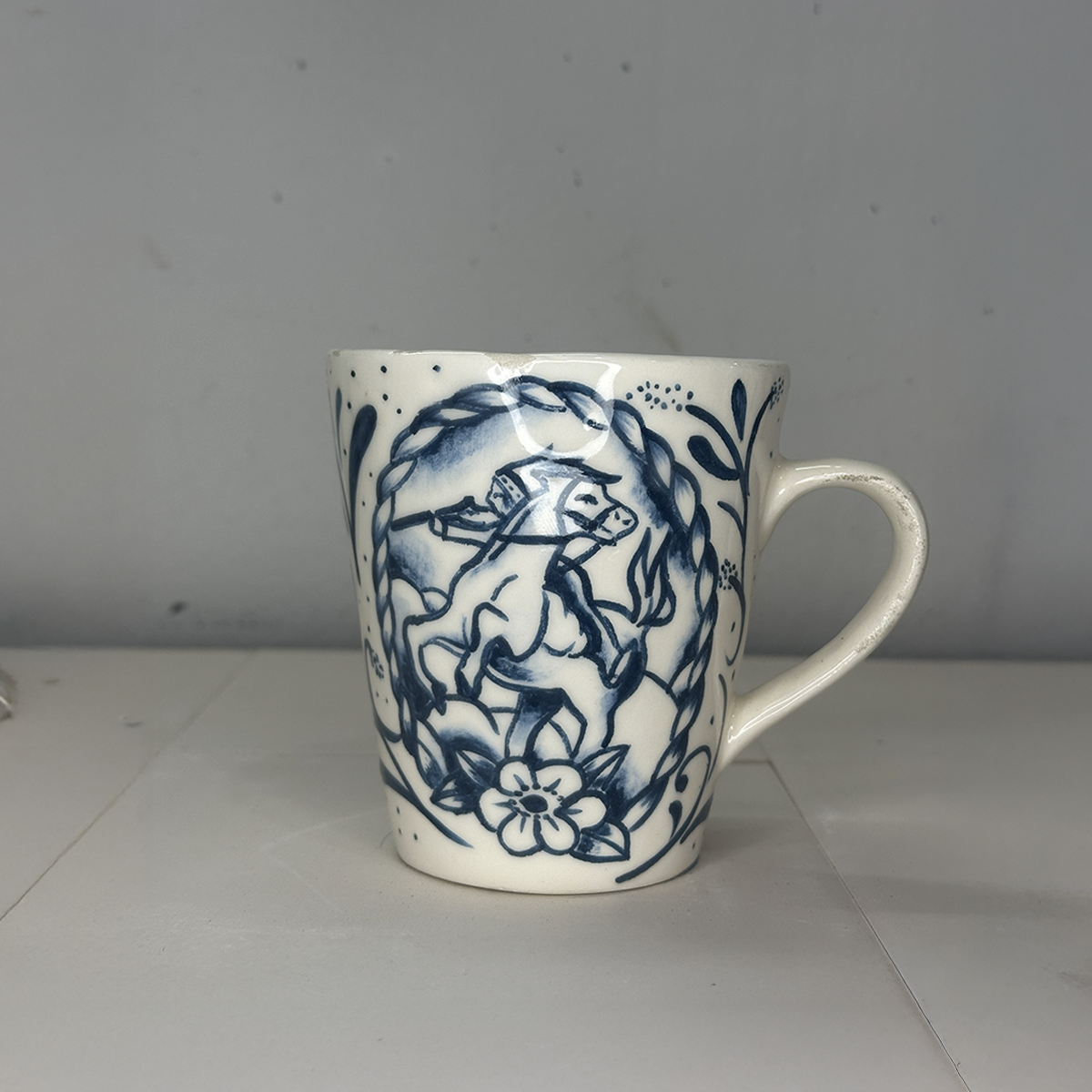 Taza de cerámica artesanal pintada a mano, con ilustración de caballo en estilo tattoo, realizada en tonos azul sobre fondo marfil. Cada pieza es única, con trazos a pincel y detalles orgánicos propios del trabajo artesanal. Cuenta con esmaltado brillante y asa cómoda, ideal para café, té o infusiones. Funcional y decorativa, pensada para uso diario o para regalar.